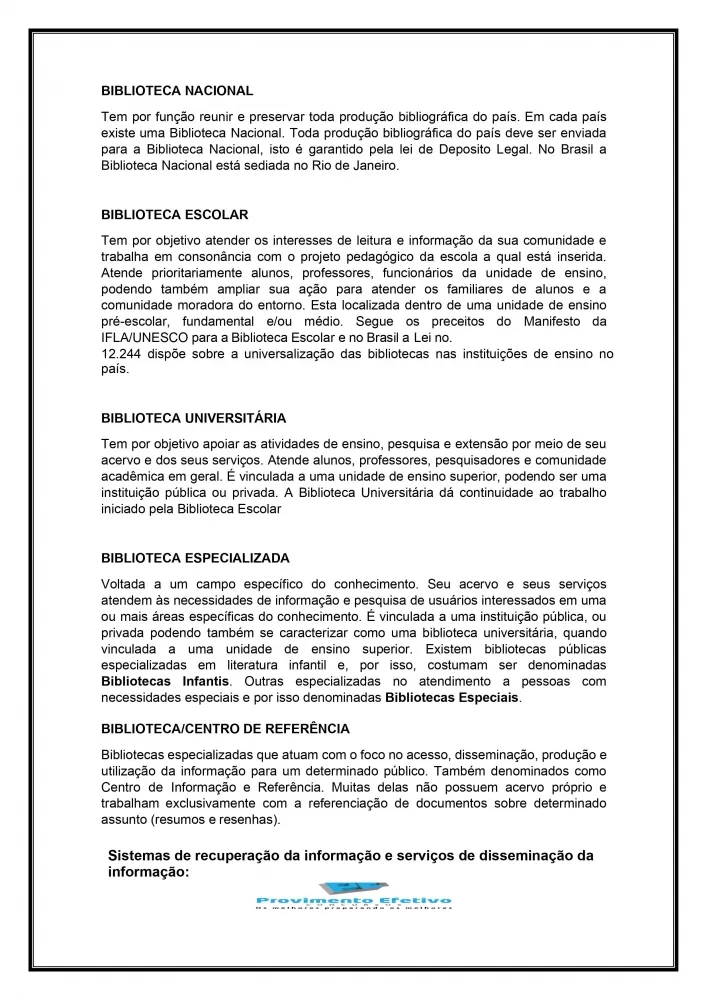 1. Formação e informação profissional, legislação e ética. 2. Fontes institucionais: centros, serviços e sistemas de documentação. 3. Processos e técnicas. 4. Organização e administração de bibliotecas. 5. Formação e desenvolvimento de coleções. 6. Planejamento bibliotecário. 7. Documentação e informação: conceito, desenvolvimento e estrutura de documentação. 8. Classificação Decimal de Dewey (CDD). 9. Classificação Decimal Universal (CDU). 10. Catalogação descritiva AACR2. 11. Indexação, resumos e tesauros: noções básicas. 12. NBR 6023/00. Serviço de referências. 13. Centro de documentação e o papel do bibliotecário. 14. Utilização e disseminação da informação. 15. Organização de arquivo. 16. Uso e acesso à base de dados, INTERNET e fontes de informação on-line.