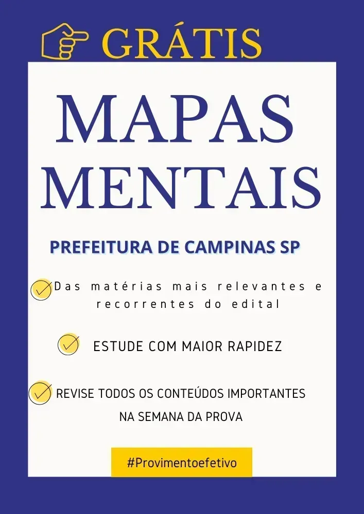 Acompanha grátis MAPAS MENTAIS das matérias mais importantes do edital, possibilitando você estudar em tempo recorde, e ainda revisar todo o conteúdo na semana que antecede a prova.