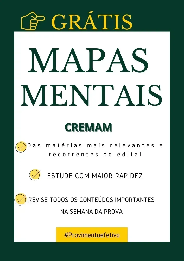 Acompanha grátis MAPAS MENTAIS das matérias mais importantes do edital, possibilitando você estudar em tempo recorde, e ainda revisar todo o conteúdo na semana que antecede a prova.