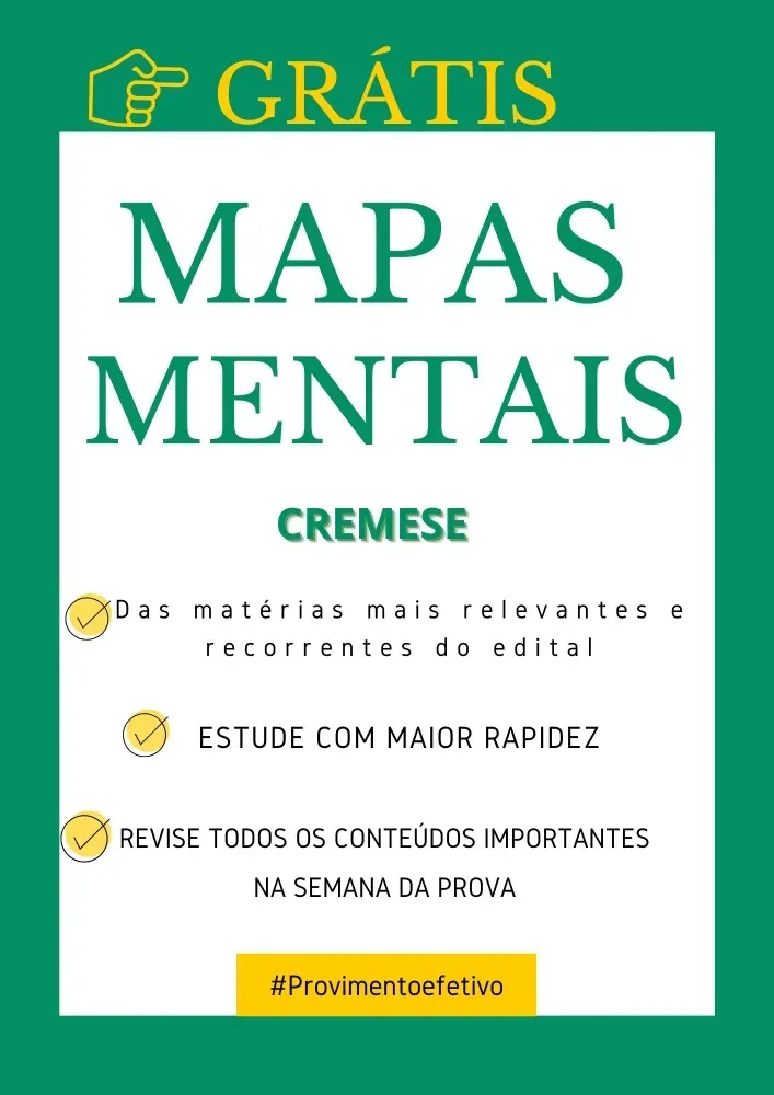 Acompanha grátis MAPAS MENTAIS das matérias mais importantes do edital, possibilitando você estudar em tempo recorde, e ainda revisar todo o conteúdo na semana que antecede a prova.